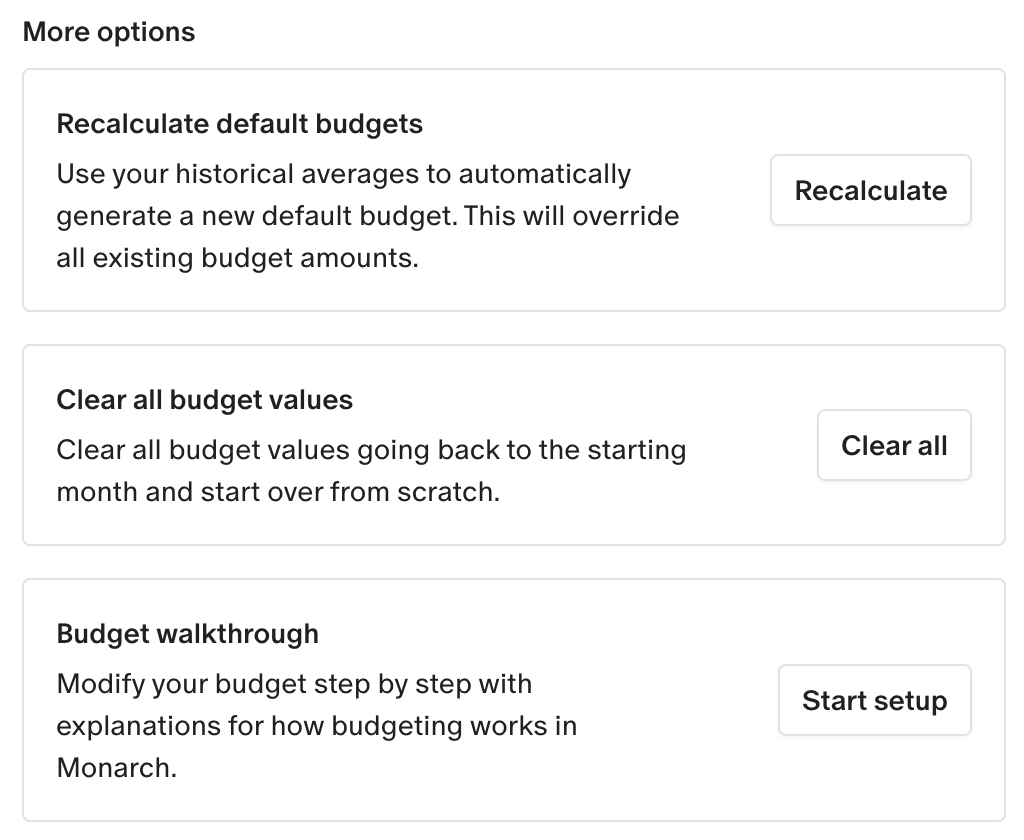 - Budget Walkthrough: Use this to go through Monarch's step-by-step walkthrough of setting up a budget. This won't override or clear your existing data, but will help ensure you have it set up correctly.
