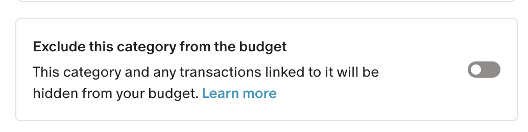 - From here, you can toggle Exclude this category from the budget. This category and any transactions linked to it will be hidden from your budget.