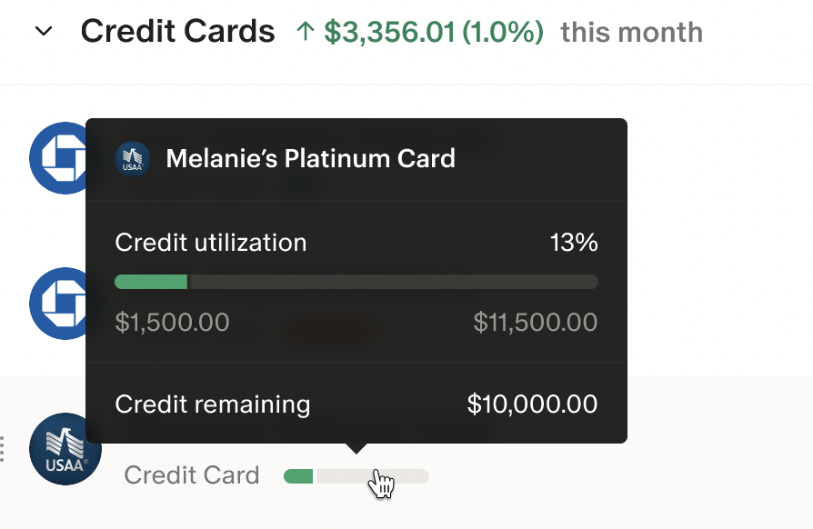 Credit utilization is an important factor in your overall credit health, and Monarch makes it easy to stay on top of it. You can view your credit utilization on both your Accounts page and within individual credit card accounts, providing greater visibility into how much credit you're using and what’s available.