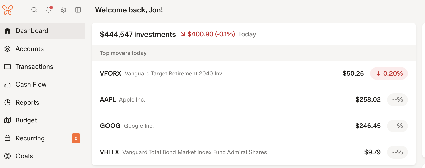 You can customize your Monarch Dashboard to show the most important parts of your financial life front and center! The Investments widget will show the total of your investments, today’s change, and a list of the top movers today.