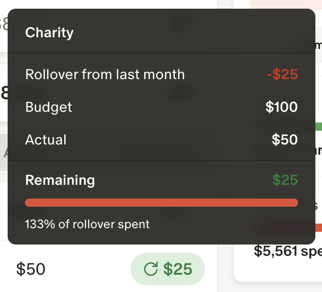 -$25 (rollover from last month) + $100 (budget) - $50 (actual) = $25 remaining to rollover