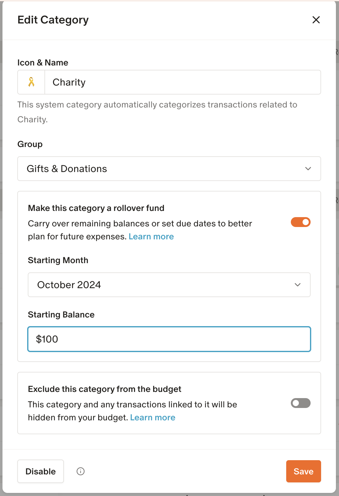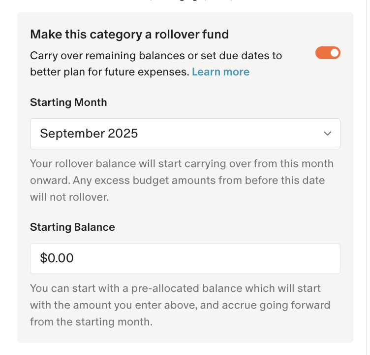 If you want to start your rollover category with more than your current monthly budget, you can set a Starting Balance. This can be done on both web and mobile from the edit category screen.
