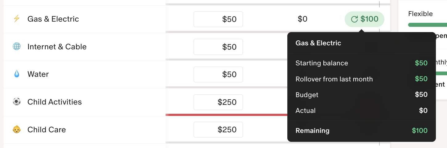 While rollovers should always be turned on for non-monthly expenses, you can set any category to be treated as a rollover expense, regardless of whether the category is in the fixed, non-monthly, or flex bucket. You can also turn the rollover option on for the larger flex bucket itself.