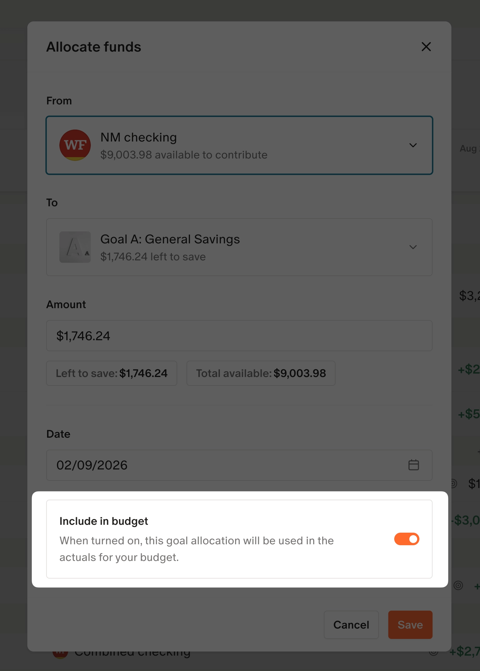 You can choose whether a manual allocation counts toward your budget actuals and whether it uses today’s date or a past date (which is useful when you're in the new month, but adjusting goals based on last month's numbers).