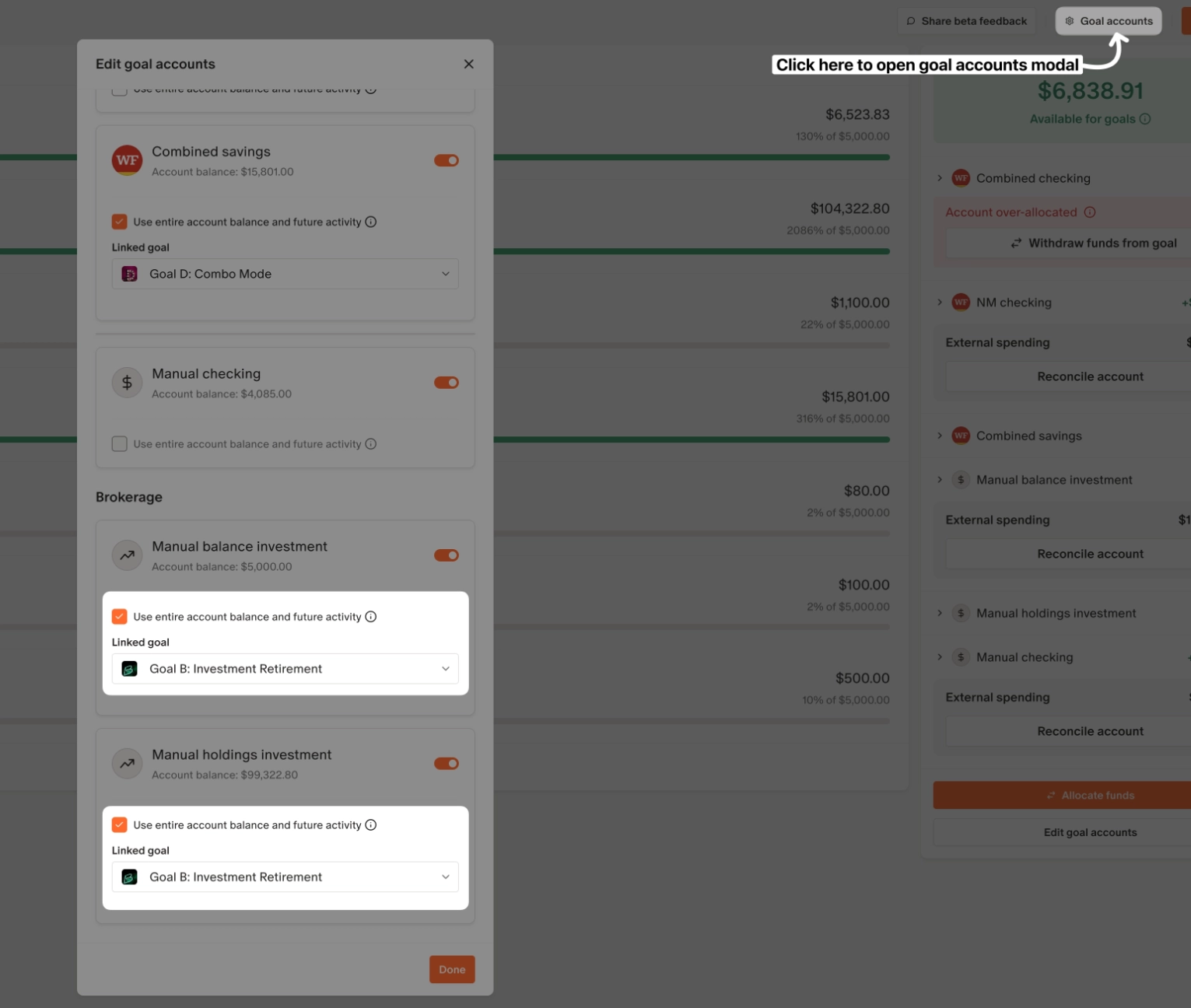 - Only accounts enabled for goals appear in the allocation list.
