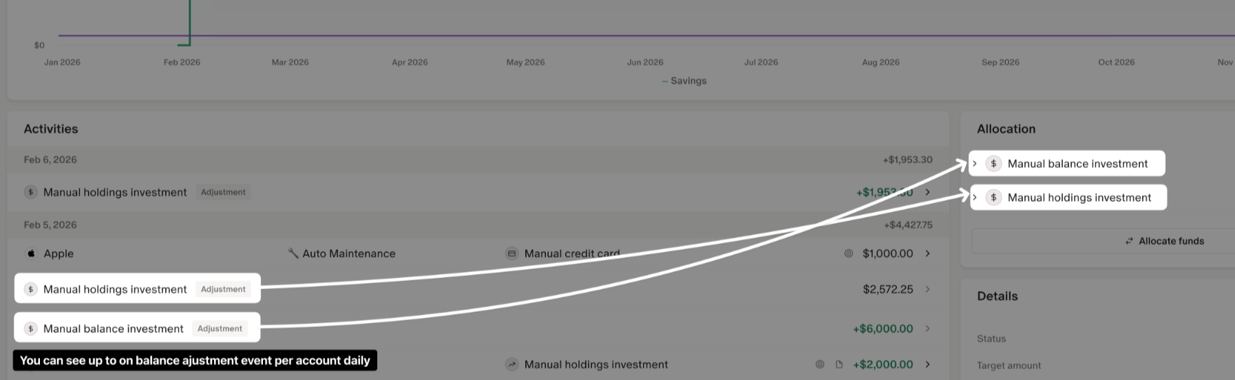 You'll see one Adjustment record per account per day in your goal activity, even if multiple changes occurred throughout the day. This keeps your activity list clean and easier to review.