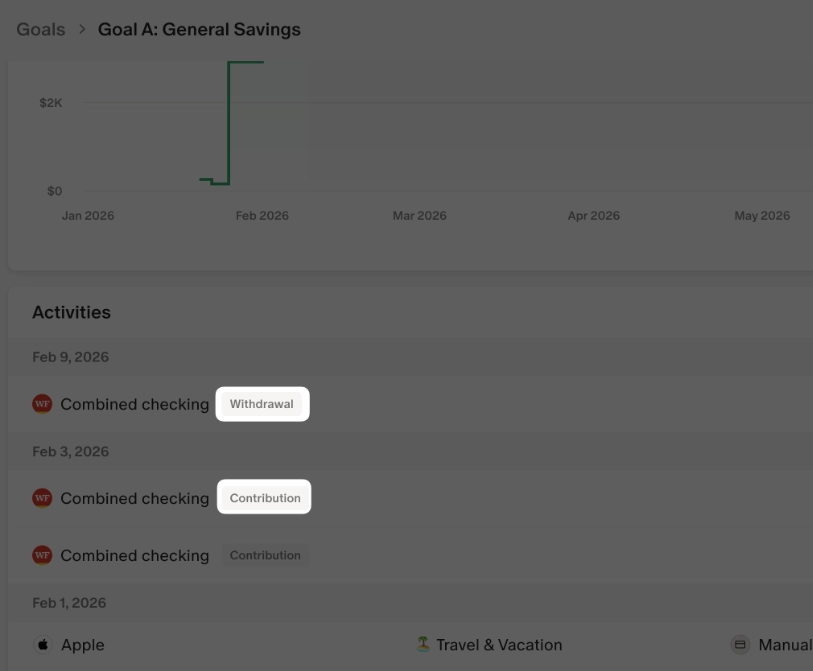 When you link income and transactions to a goal, linked transactions will appear in the goal activity list and automatically count toward your goal actuals in the budget. Credit transactions count as contributions, and debit transactions count as withdrawals.