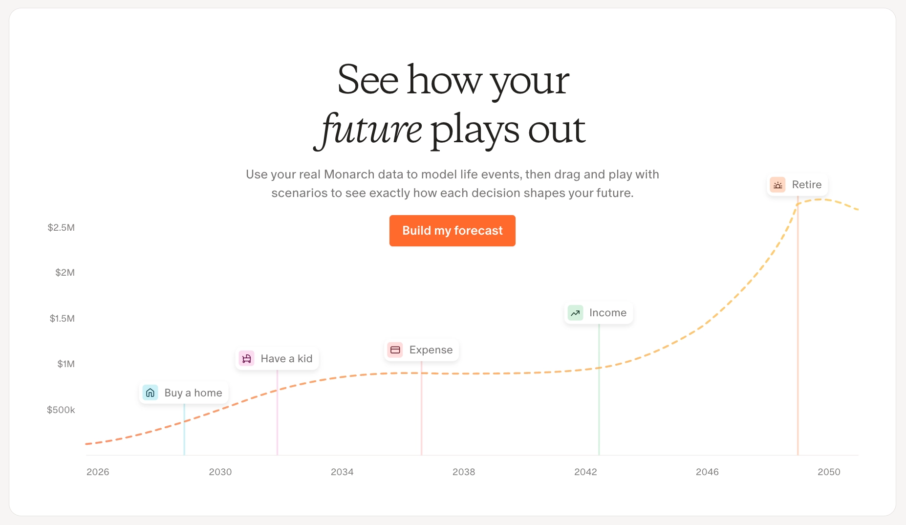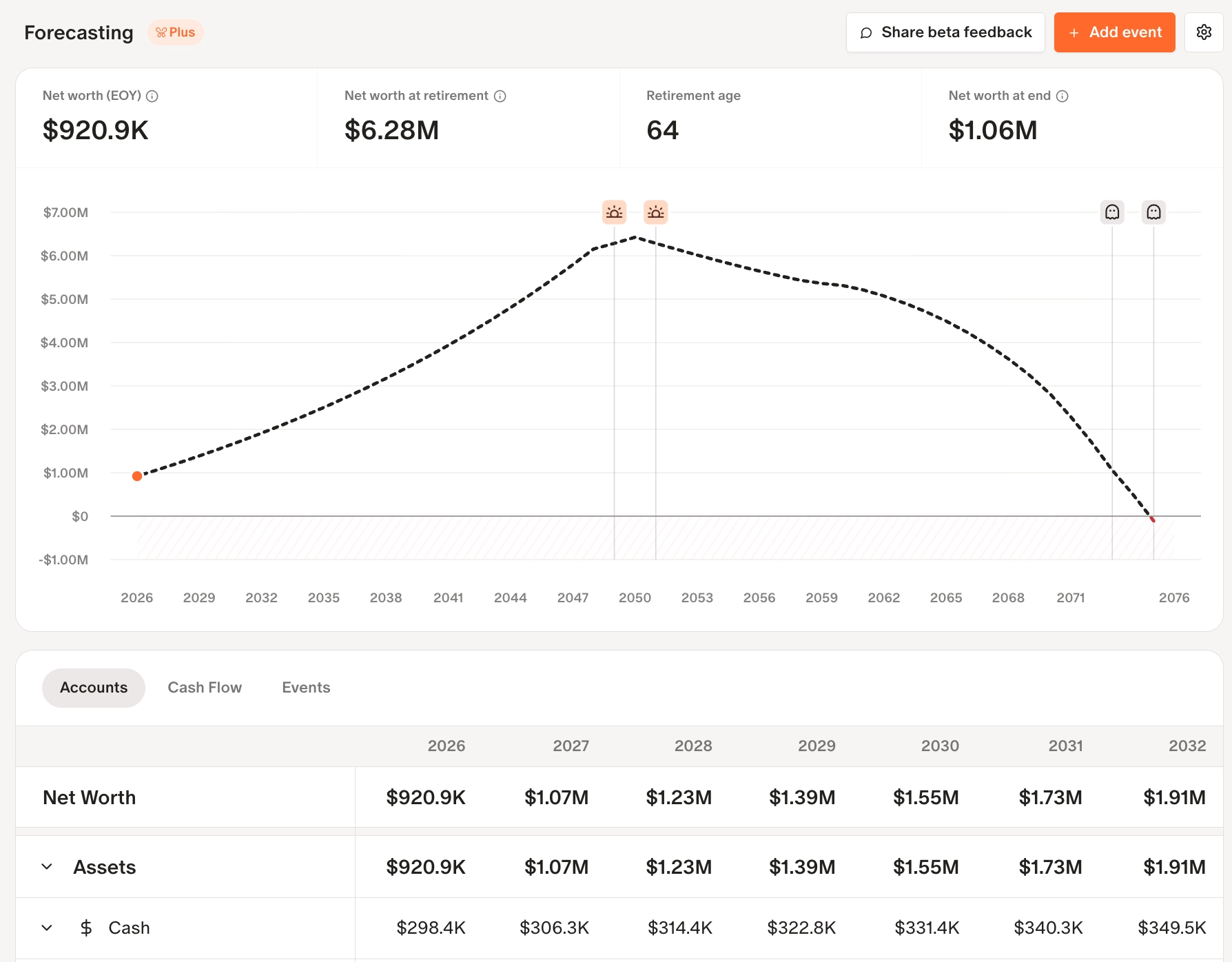 Forecasting lets you project your net worth and cash flow over time based on your real account data, spending history, and life events — letting you model the financial impact of major milestones like retirement, buying a home, or having a child.