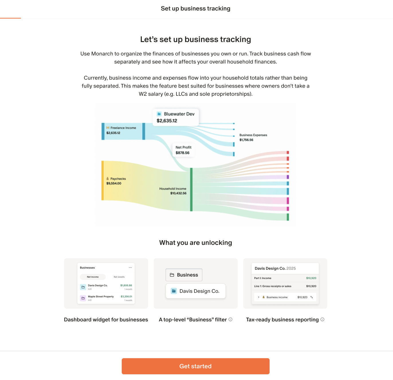 Business tracking is available to Monarch Plus members. All Monarch members continue to have full access to Goals, budgeting, Cash Flow, Net Worth, and all core features. Learn more about Monarch Plus here.