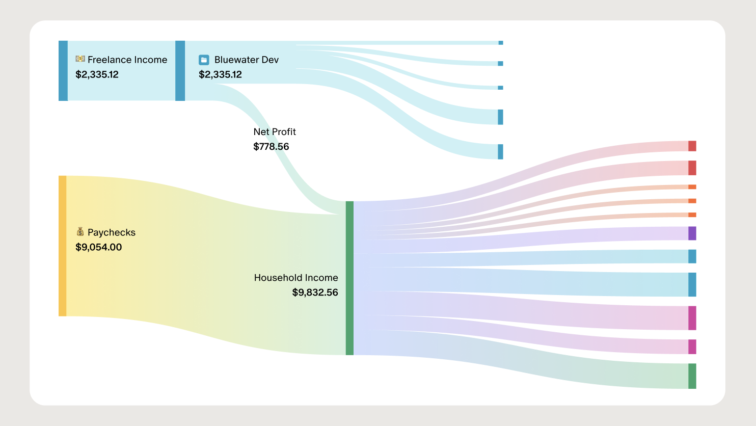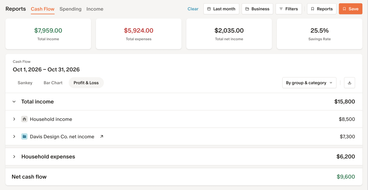 - Access richer reporting for each business: Sankey charts are now business-aware, key charts can be grouped by business or household, and a Profit & Loss table shows exactly what each business is earning and spending.