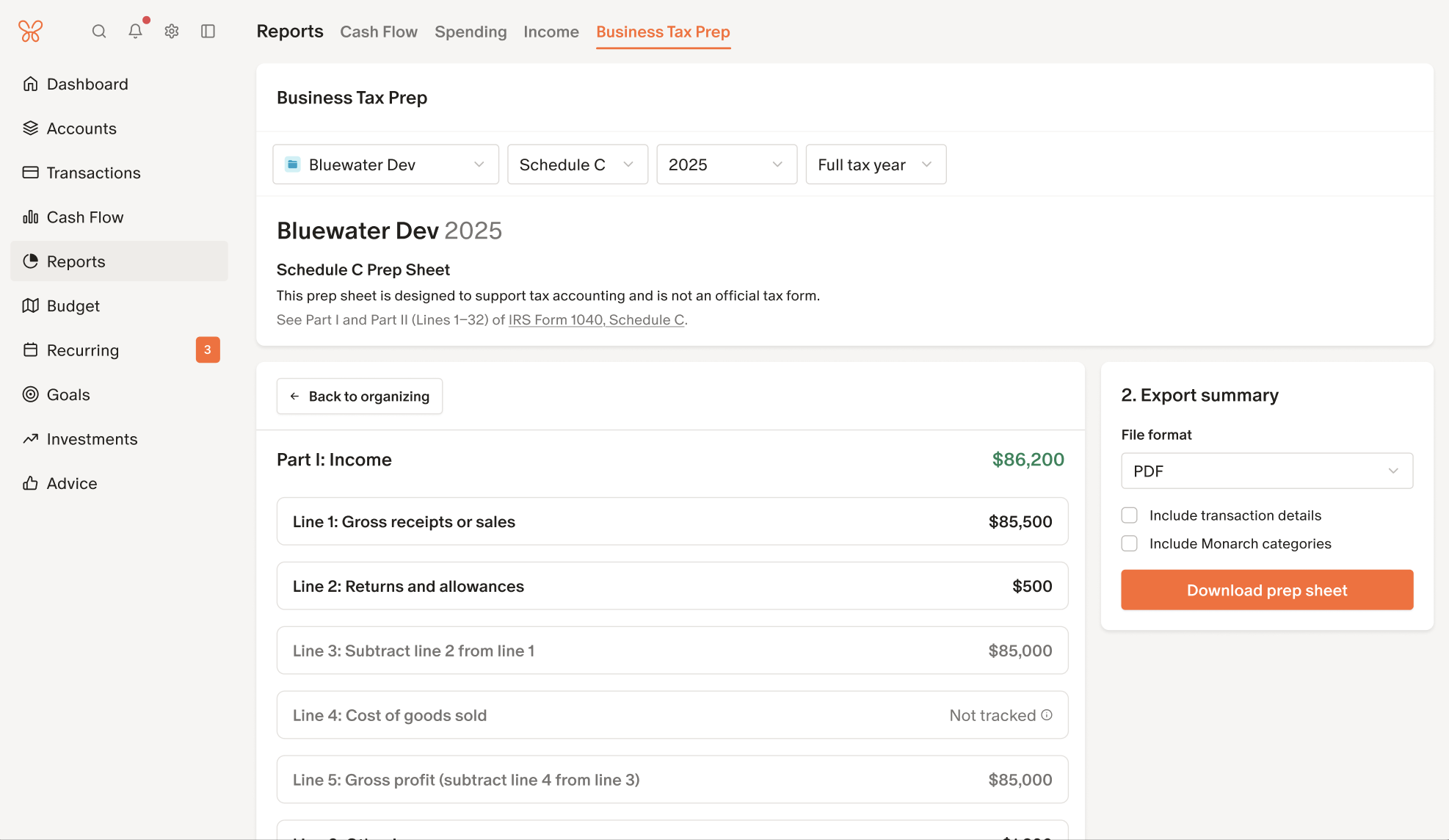 Note: The Schedule C report is a preparation aid. Monarch does not provide tax advice, and the exported report is not a substitute for a filed tax return. We recommend reviewing your export with a tax professional.